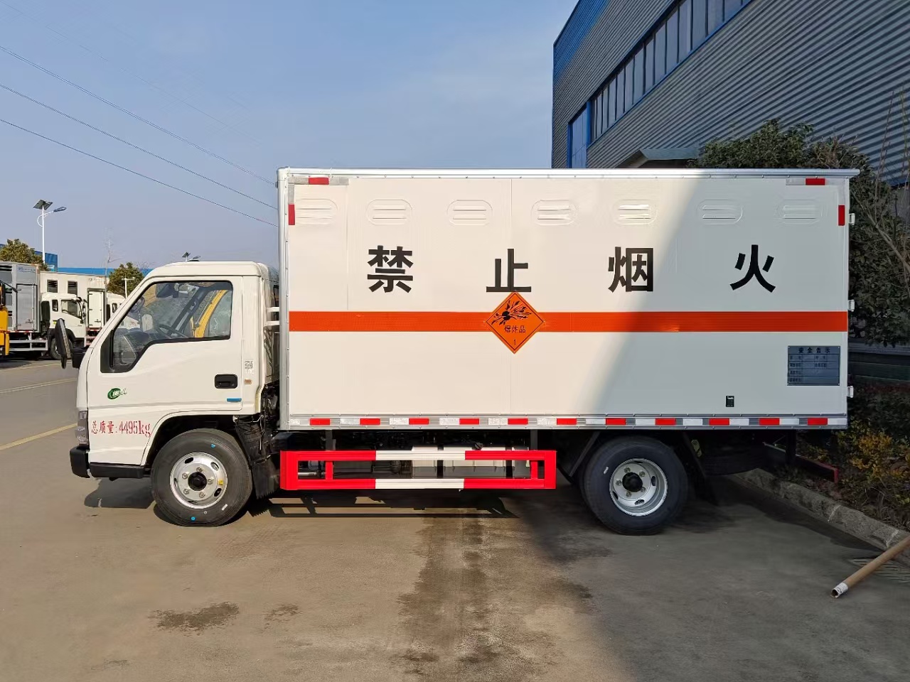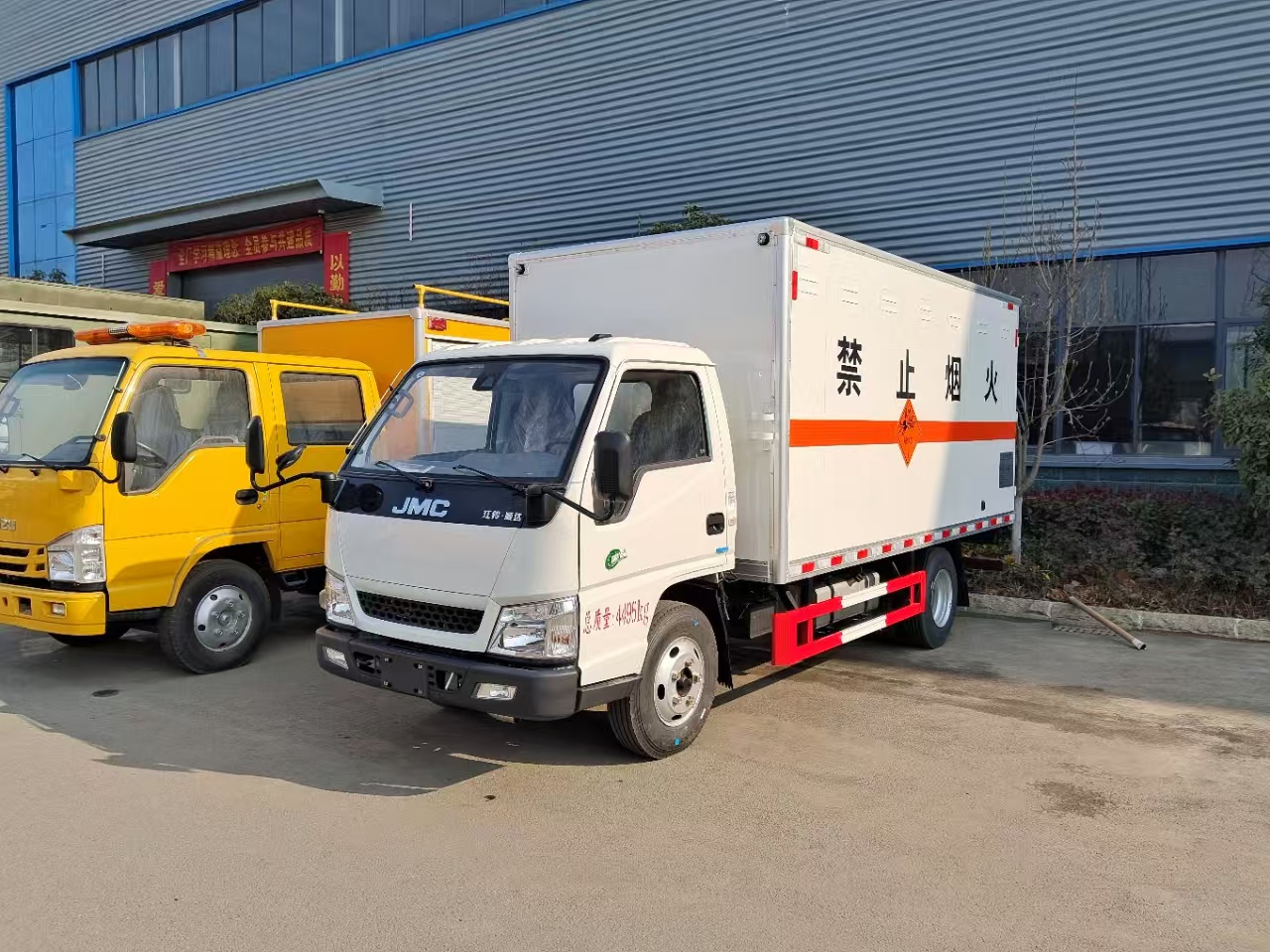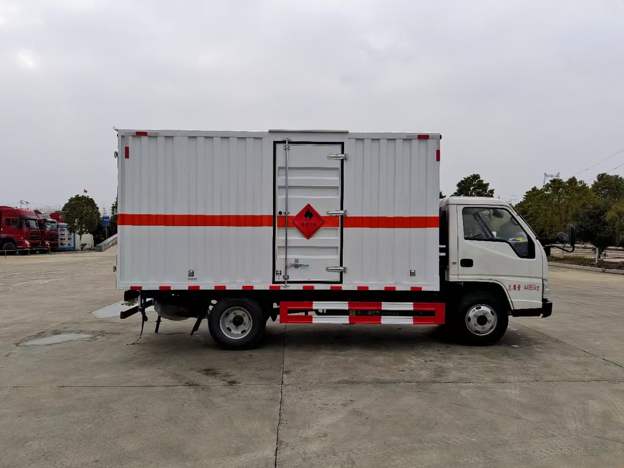 | 貨箱配置 | 廂體為雙層金屬骨架結(jié)構(gòu),外板采用冷軋鋼板,中間填充阻燃泡沫,內(nèi)飾為鋁板。底板為平板上鋪防靜電膠皮。廂內(nèi)兩側(cè)加裝固定貨物臥環(huán),門框帶防盜報(bào)警器,頂部帶煙霧報(bào)警器,廂體右側(cè)選裝側(cè)門,隨車配2個滅火器,危險(xiǎn)標(biāo)志牌,防火帽,危險(xiǎn)品三角頂燈。 | ||