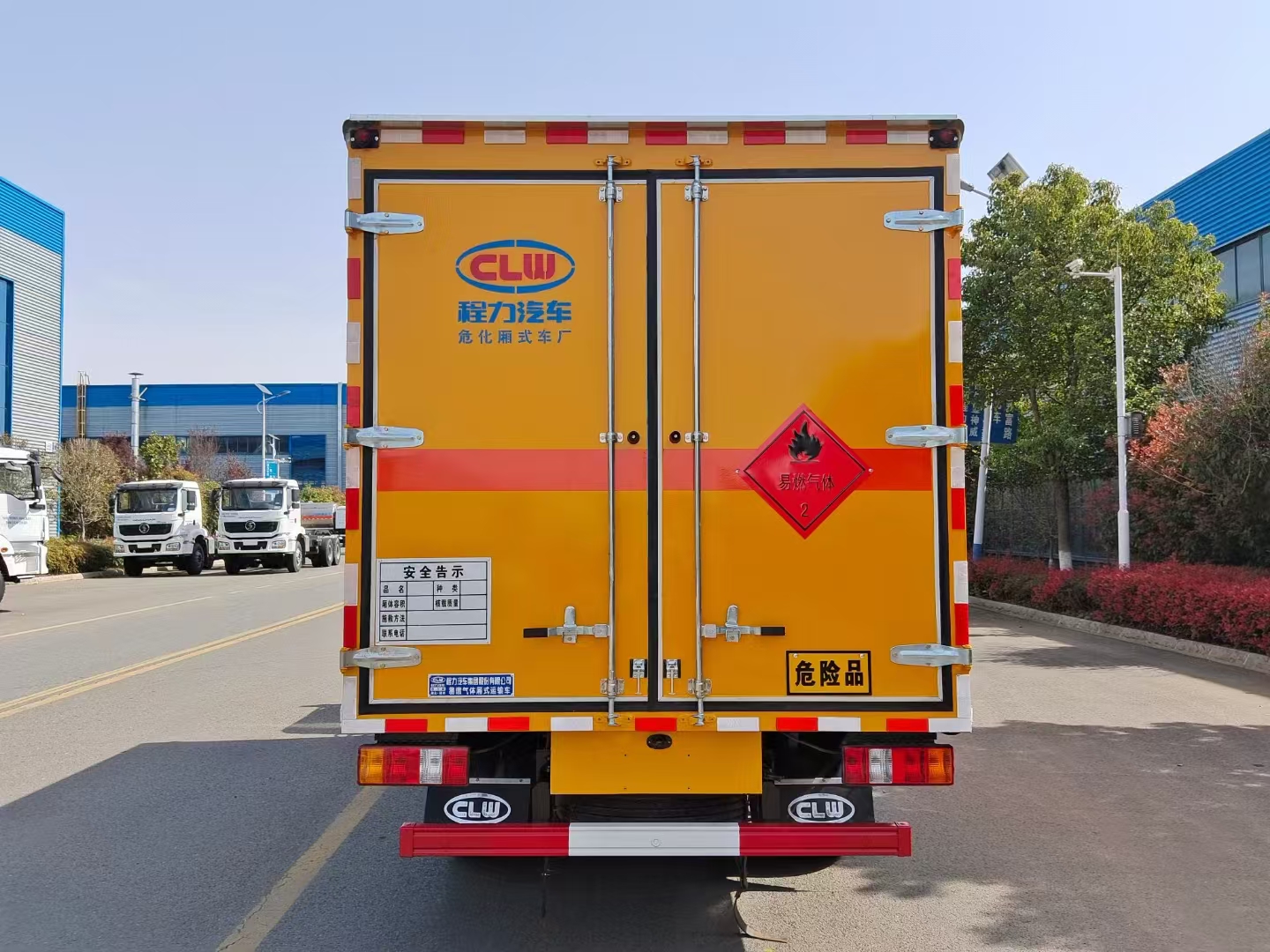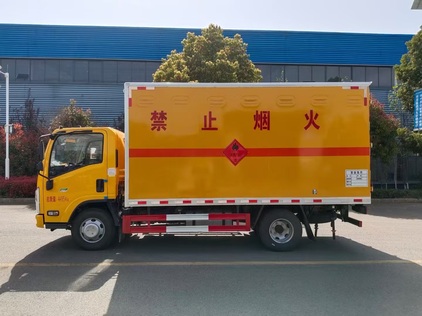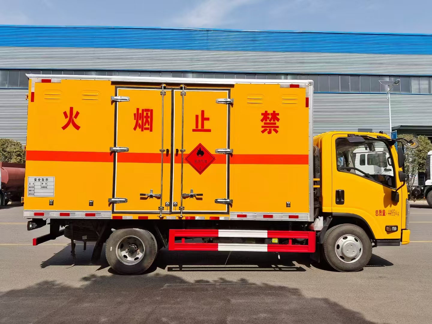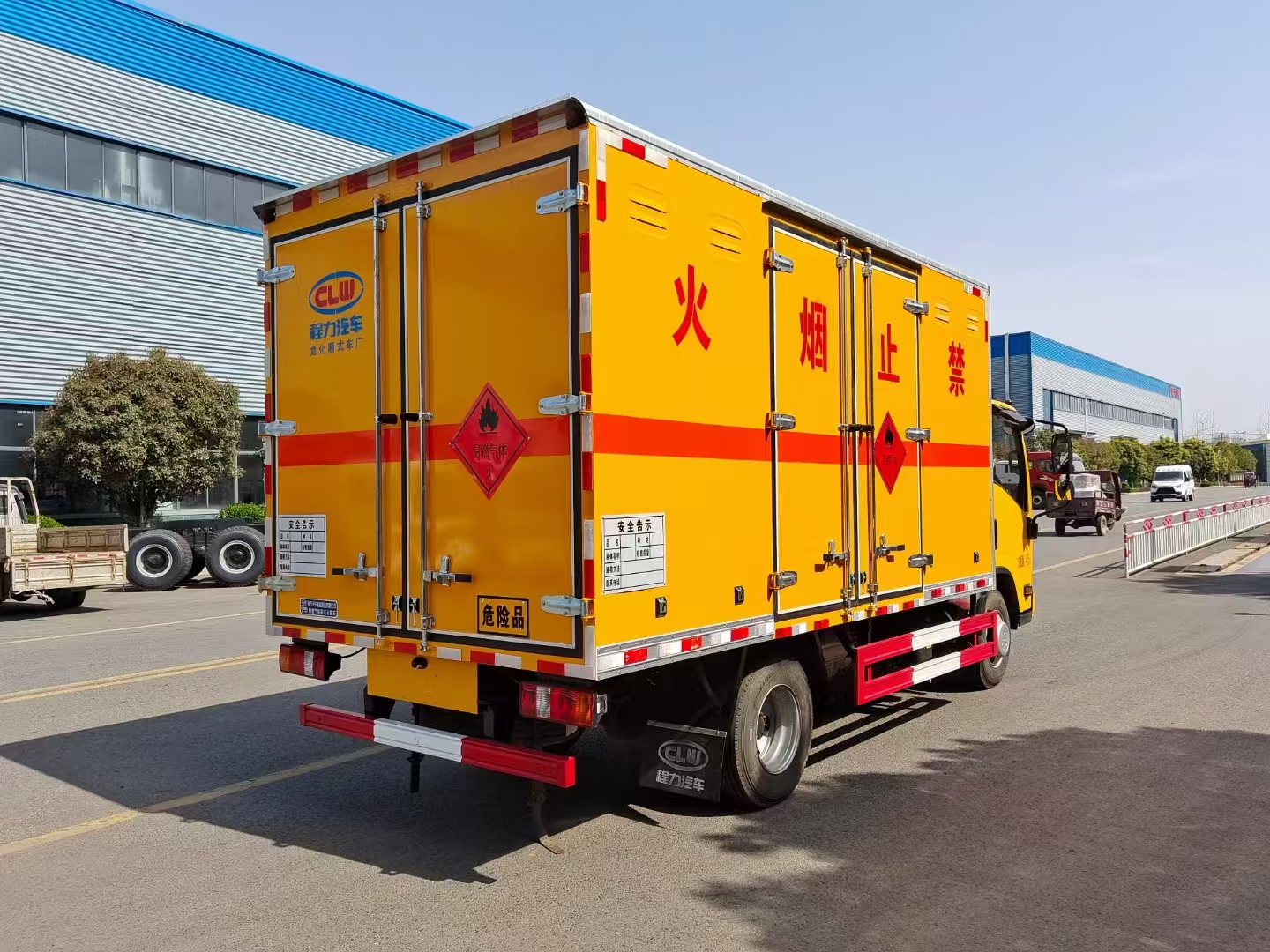 | 貨箱配置 | 廂體為雙層金屬骨架結(jié)構(gòu),外板采用冷軋鋼板,中間填充阻燃泡沫,內(nèi)飾為鋁板。底板為平板上鋪防靜電膠皮。廂內(nèi)兩側(cè)加裝固定貨物臥環(huán),門框帶防盜報警器,頂部帶煙霧報警器,廂體右側(cè)選裝側(cè)門,隨車配2個滅火器,危險標(biāo)志牌,防火帽,危險品三角頂燈。 (選裝瓦楞板貨箱) (尾部可選裝液壓升降尾板) | ||
